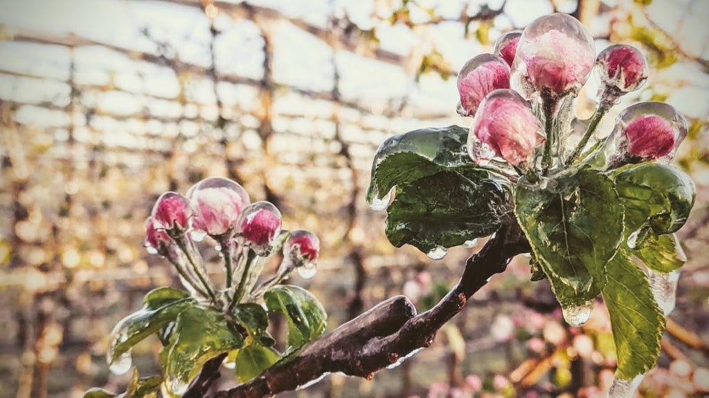 Late spring frost protection system is based on the phenomenon of water anomaly when when changing the physical state 1 gram of water from liquid to solid state releases 80 Cal of energy. This energy is used to maintain the temperature of the flower and young fruit at a temperature of 0 to -2ºC. At the same time, an icy crust of moist ice is made over the flower and the fruit, whose temperature is 0ºC, and a needle effect is used to protect the genus.